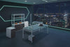 Escritorio de 1.80x0.75x0.75 m. Cubierta de cristal esmerilado de 9mm con cantos pulidos y base metálica terminada en pintura epóxica horneada.