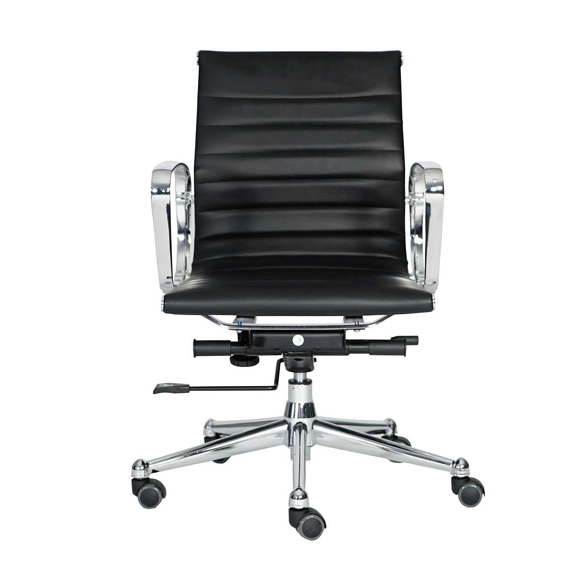 Sillón ejecutivo, asiento y respaldo medio en techno leather, negro, mecanismo de rodilla, slim brazos en aluminio, pulido y base de 5 puntas en cromo.